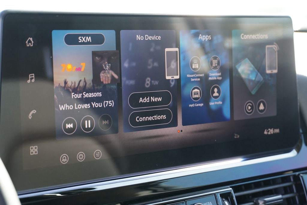 - Radio: AM/FM Audio System w/NissanConnect -inc: 6 speakers, 5G Wi-Fi hotspot, wireless Apple CarPlay and Android Auto, 12.3" multi-function information display, SiriusXM satellite radio, 2 front USB connection (1 type C charge and data ports), Bluetooth® hands-free phone system, streaming audio and messaging and hands-free text messaging assistant