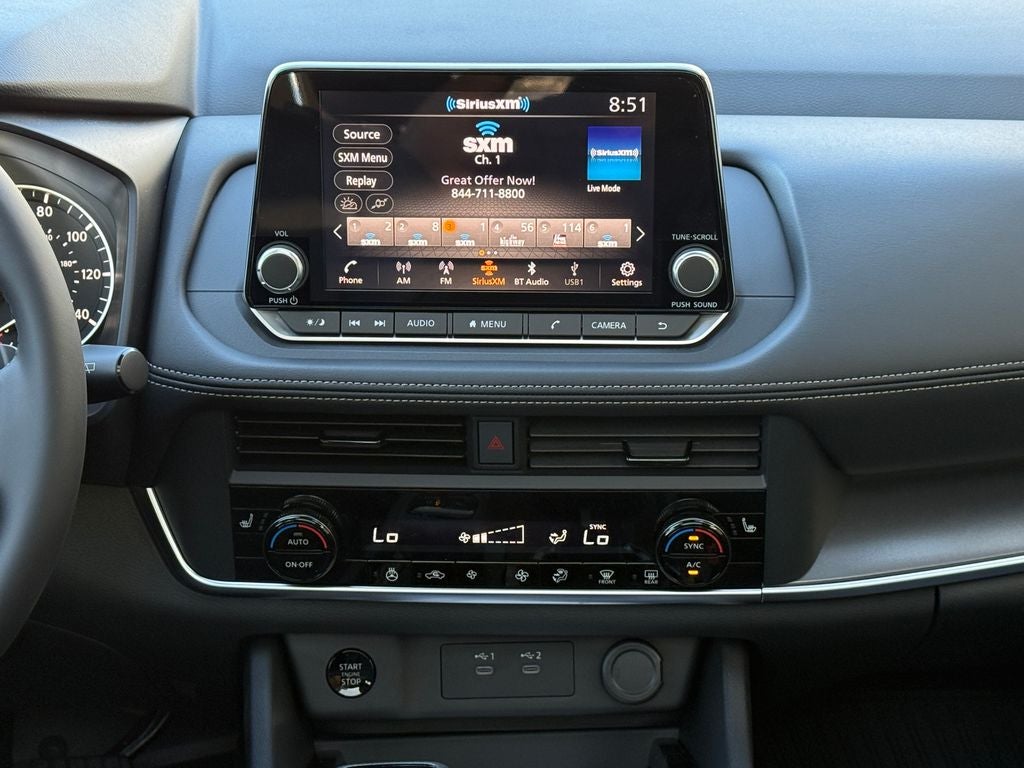 - Radio: AM/FM NissanConnect -inc: 6 speakers plus 2 tweeters, Apple CarPlay, Android Auto, 8" color touch screen display, Bluetooth®, 2 front USB type-C, Wi-Fi hotspot and NissanConnect Services powered by SiriusXM