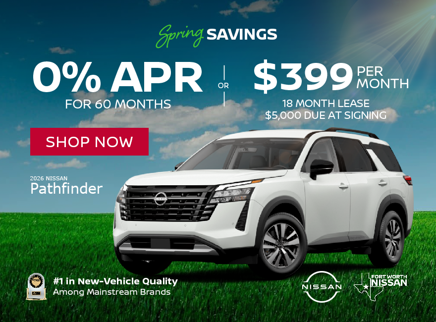 APR Offer with approved credit through NMAC on all new in-stock 2026 Pathfinders. 0% is for 60-month term. Lease offer based on 5N1DR3BS0TC203914 & 5N1DR3BS2TC214350, 2 or more available at this offer. Lease sales price $39,688, 18 month lease, 10,000 miles per year and $5,000 due at signing. For both offers, Tax, Tittle, fees and dealer added accessories are additional.